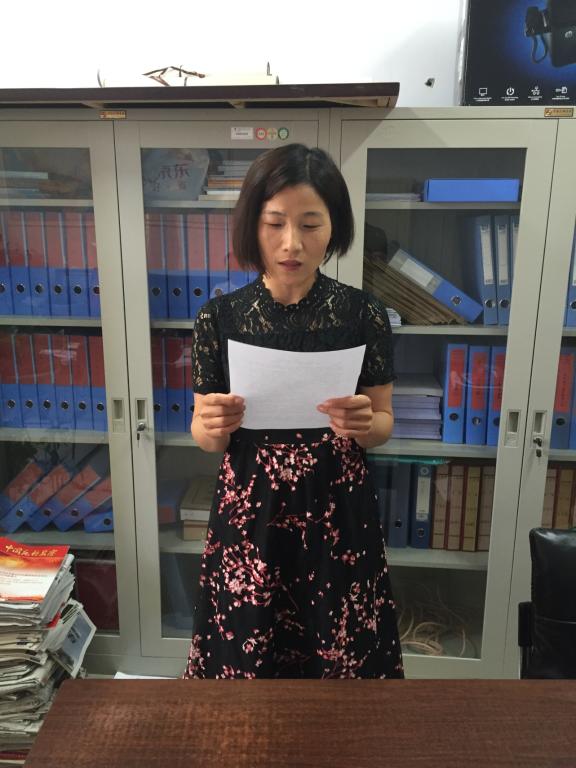 图为周翠英老师朗读题为《为党分忧、为民解难,贵在时时刻刻》的文章。
