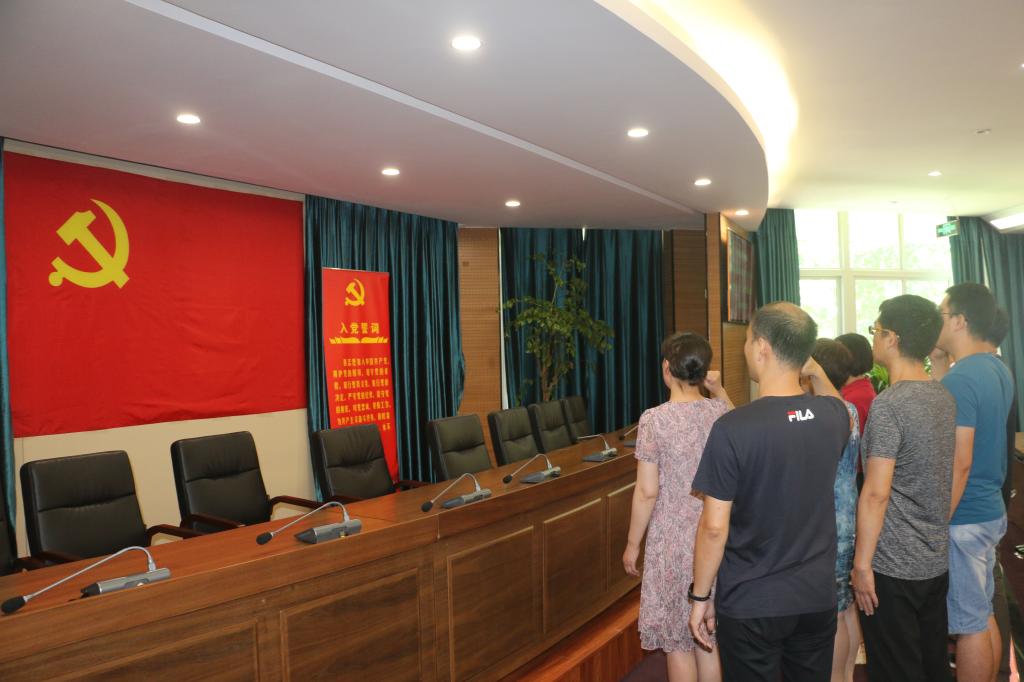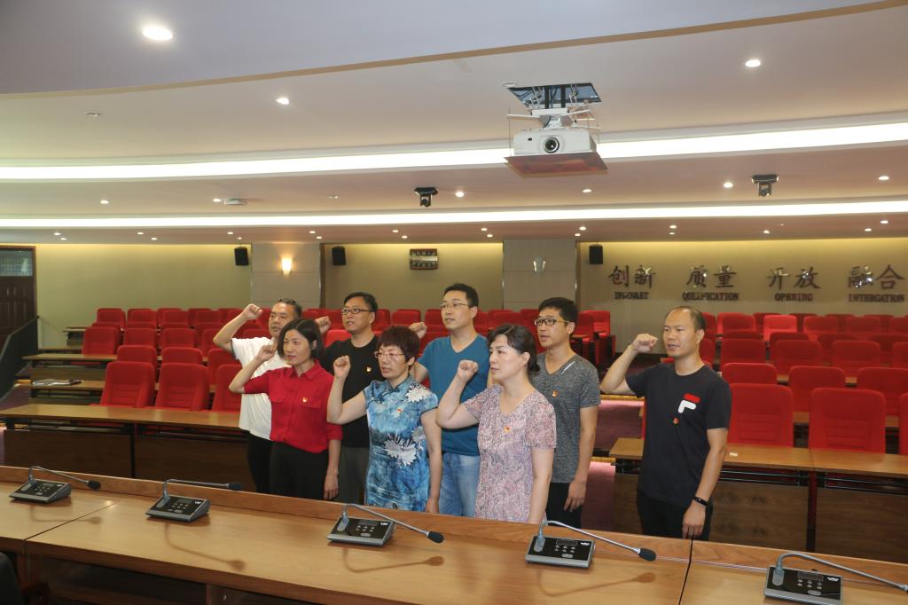 联合科技开发处(资产经营资产办公室)党支部,纪检监察室党支部全体党员佩戴党徽,举起右手、握紧拳头,在党支部书记杨华的领誓下,向党旗庄严宣誓,重温入党誓词。