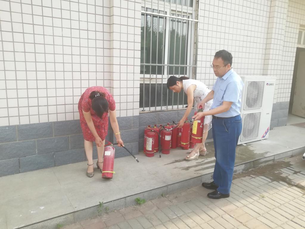 图为纪检监察室工作人员在学习消防设备使用方法。